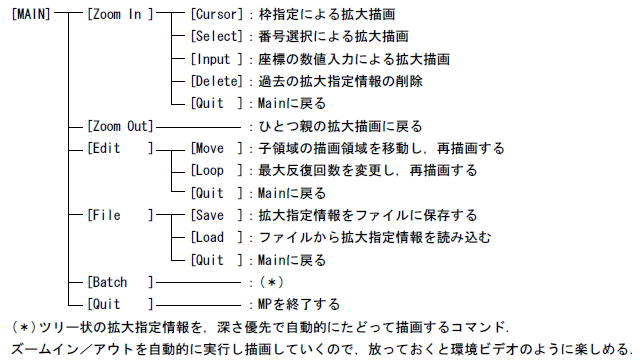 Pyxisのハンドリングのためにサポートソフトウエア(名称MP)を作成しました.主な処理は2.2で説明したようなハンドリング処理と画面描画です.しかし折角ですので,M集合の探検に便利な機能(コマンド)を用意しました.