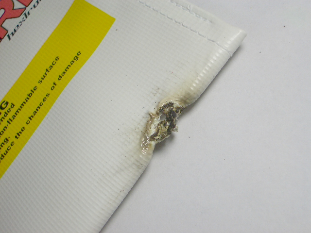 左はUnited Hobbiesで見つけたリポ充電用の耐火バッグです。『これは画期的』と思って早速購入。試しにライターの火であぶってみましたら、残念ながら穴が開いてしまいました。(^^;;; 確かに自己消火性はあるようですが、どれほどの効果があるのかは甚だ疑問です。